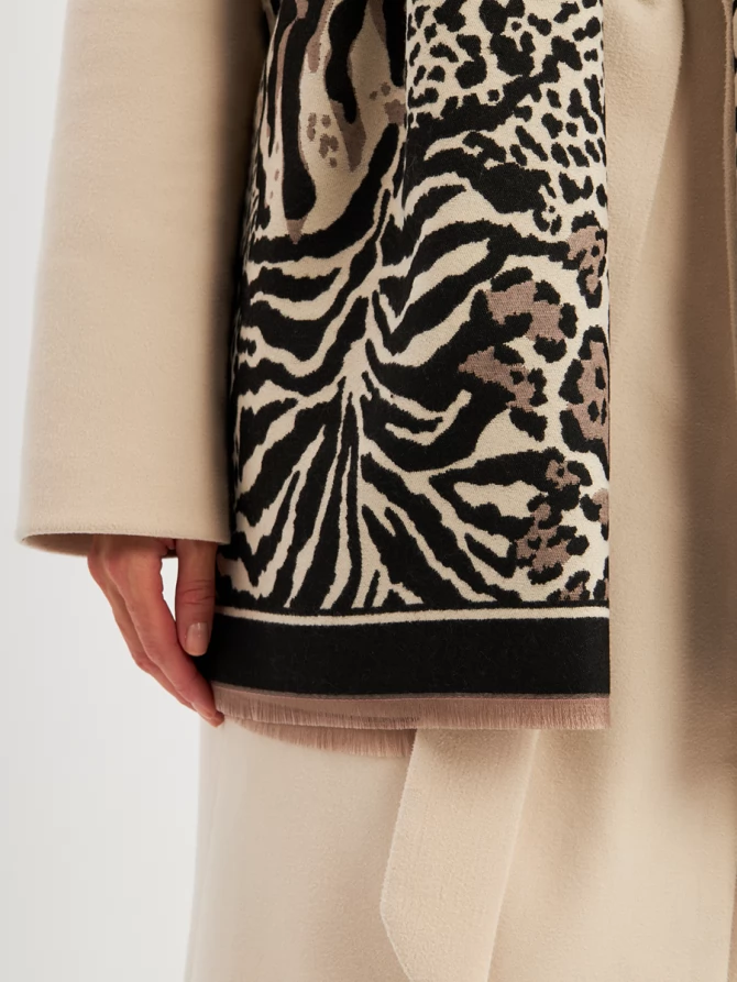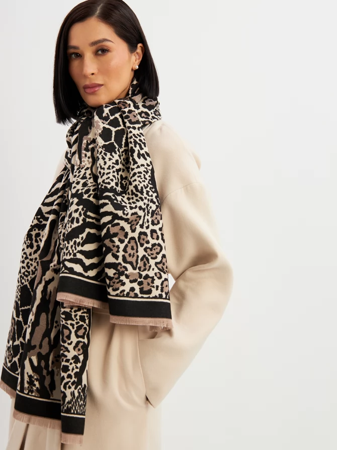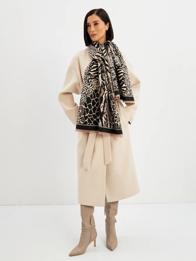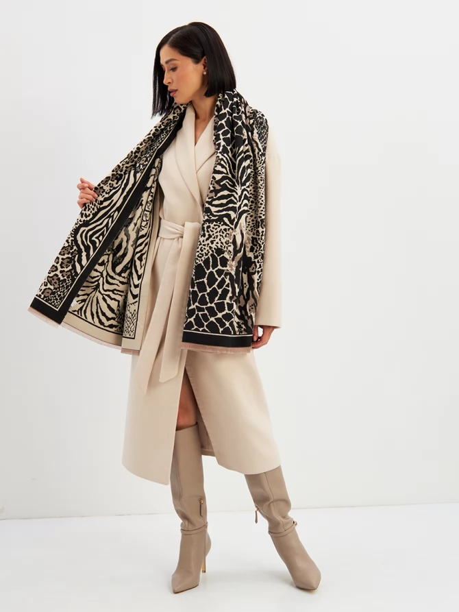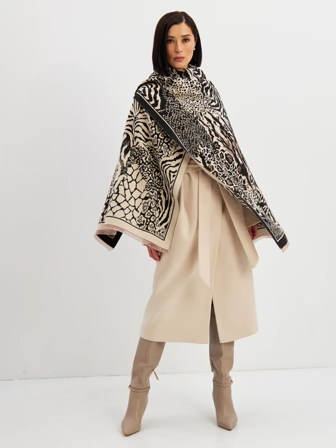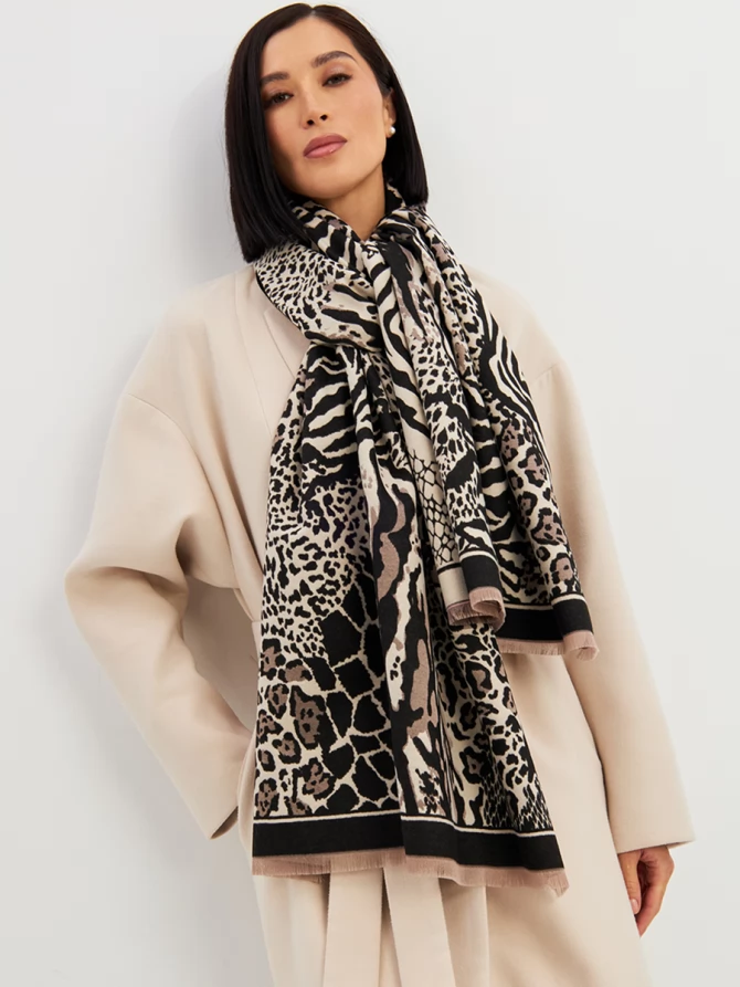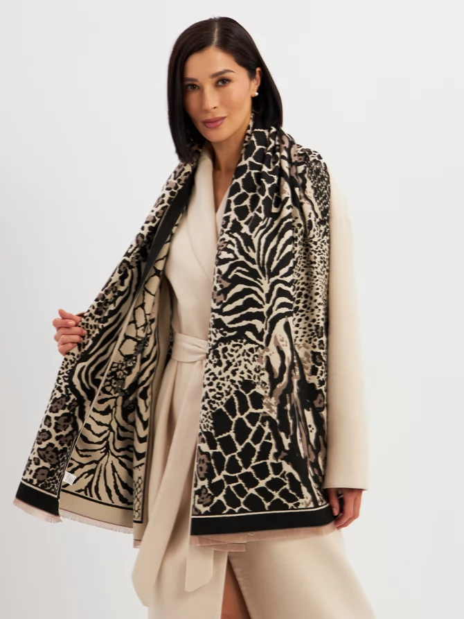 Окутайтесь в объятия роскоши и актуальных трендов! Палантин украшен завораживающим анималистичным принтом, сочетающим в себе дерзость леопарда и графичность зебры в универсальной черно-бежевой гамме. Этот узор — абсолютный хит мировых подиумов, который мгновенно придает вашему наряду элегантность и характер.
