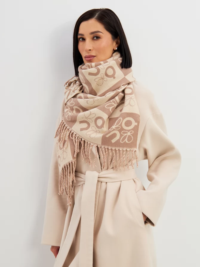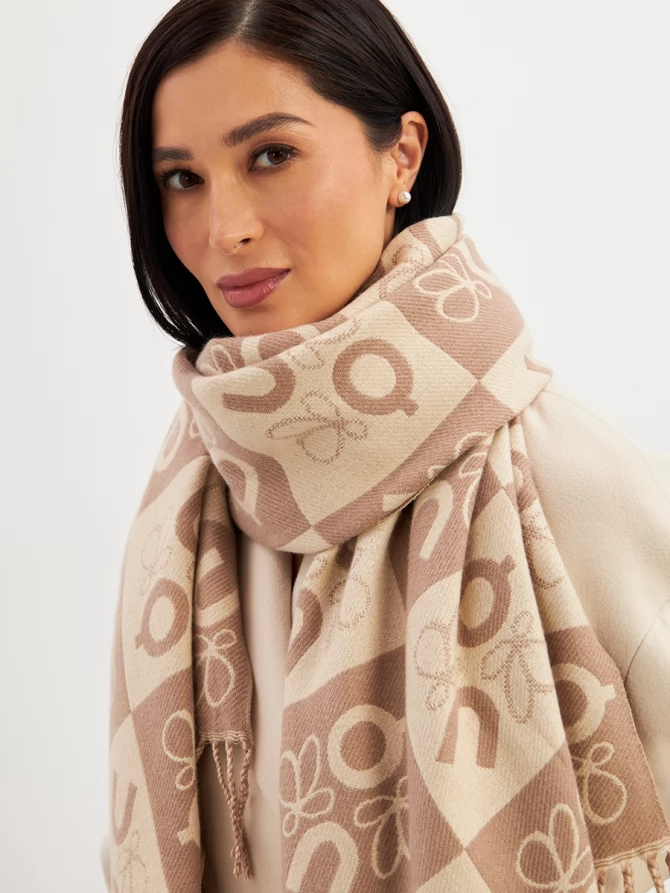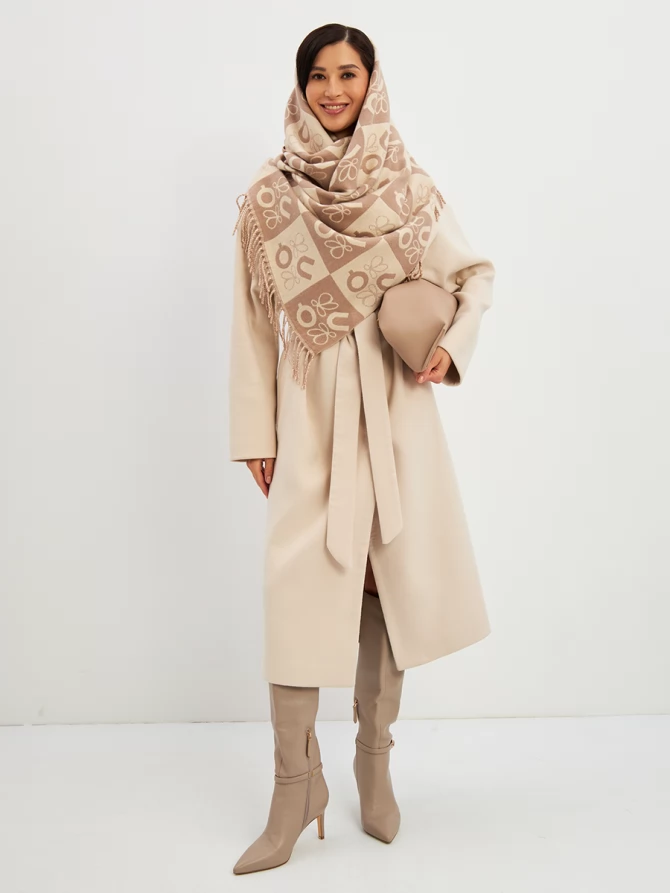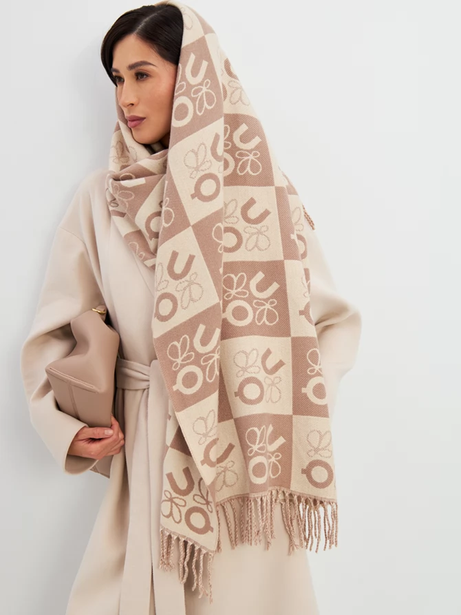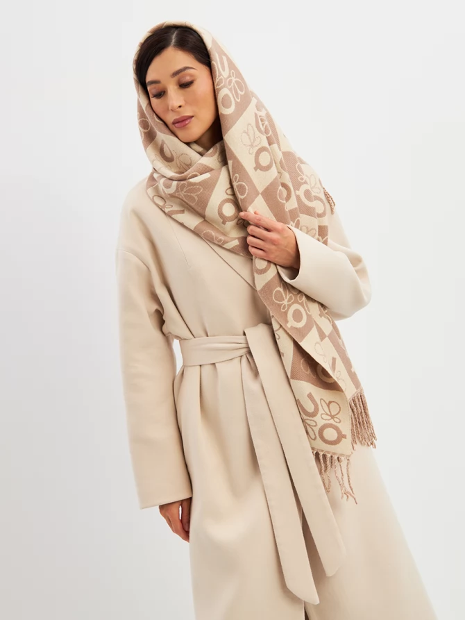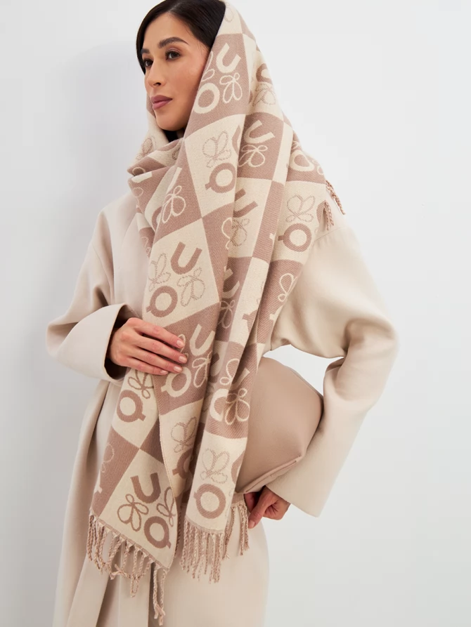 Наш большой, невероятно мягкий и нежный палантин выполнен из тонкой ткани, которая приятно обволакивает, даря ощущение тепла и уюта. Его уникальный рисунок – это стильное сочетание бежевых и кремовых оттенков в клетчатом дизайне с авторскими элементами, напоминающими монограммы или символы, что придает аксессуару особую изысканность. Эти акцентные детали выделят вас из толпы, подчеркивая вашу индивидуальность и тонкий вкус.