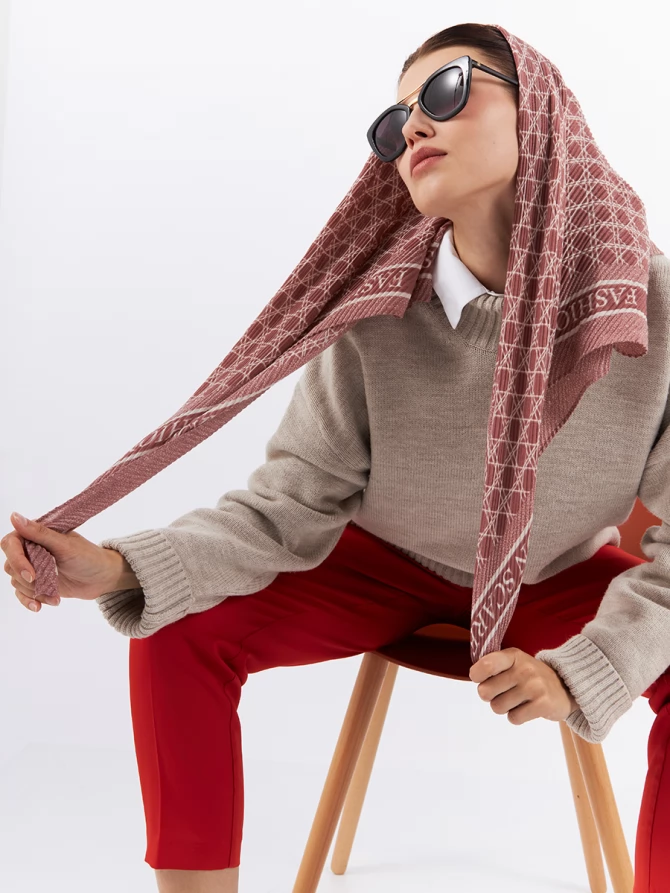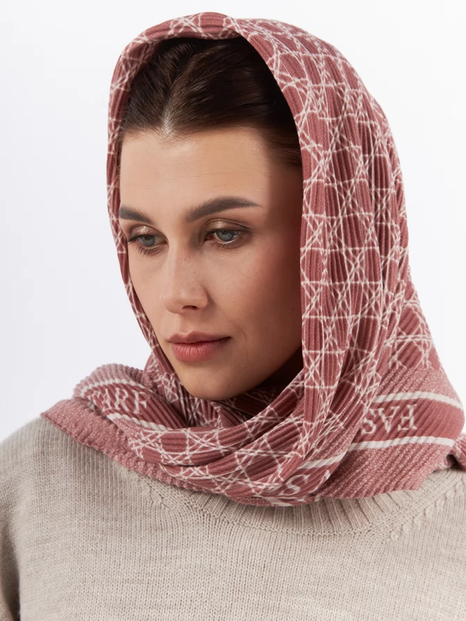 Дизайн платка — это гармоничное сочетание актуальных трендов и классической элегантности. Его двусторонняя природа позволяет создавать разнообразные образы: с одной стороны вас порадует утонченный геометрический принт, а с другой — акцентные полосы с надписью "FASHION", добавляющие современное звучание. Нежный оттенок пыльной розы с белым узором идеально впишется в любой сезонный гардероб, добавляя нотку изысканности и шарма.