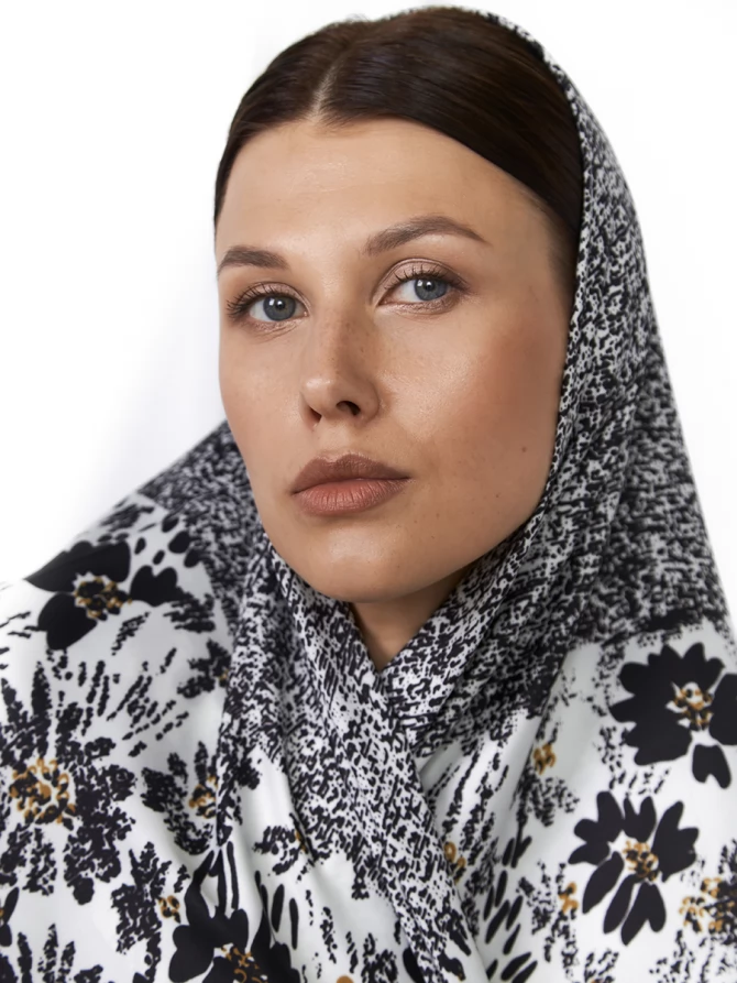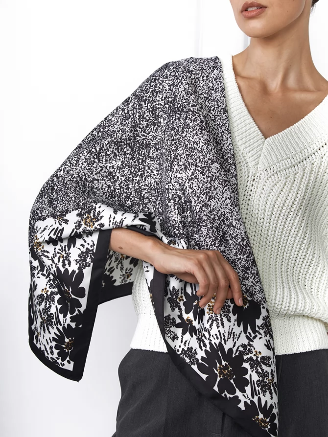 Добавьте изысканный акцент в свой гардероб с нашим великолепным двусторонним платком. Этот аксессуар — настоящее произведение искусства, созданное для тех, кто ценит уникальность и безупречный стиль. Наш платок покоряет своей универсальностью: одна сторона украшена нежным цветочным узором в черно-белой гамме с тонкими золотистыми штрихами, символизирующими роскошь и элегантность, а вторая — стильным абстрактным принтом, напоминающим художественные мазки.