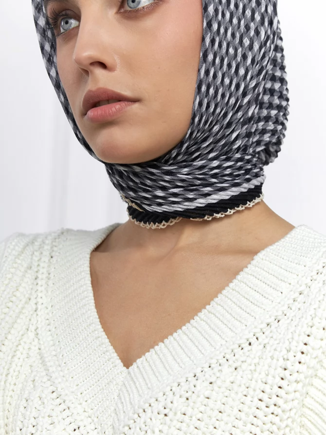 Этот большой, мягкий и невероятно нежный платок выполнен из тонкой, жатой ткани, которая подарит вам ощущение легкости и комфорта. Его актуальный черно-белый клетчатый принт — это классика, которая всегда остается в тренде, добавляя образу изысканности и шарма. Идеальный выбор для тех, кто ценит как мировые модные тенденции, так и проверенную временем элегантность.
