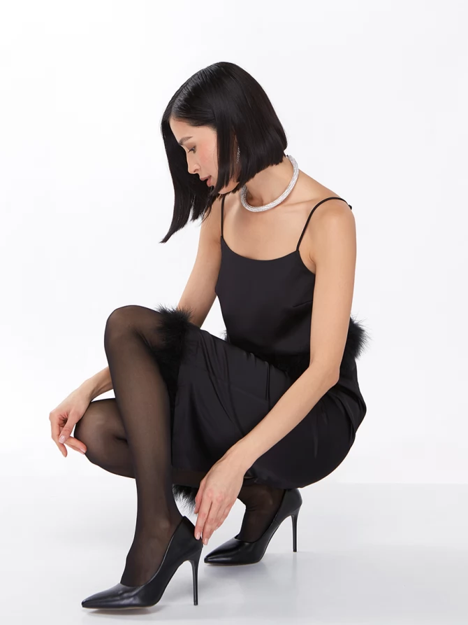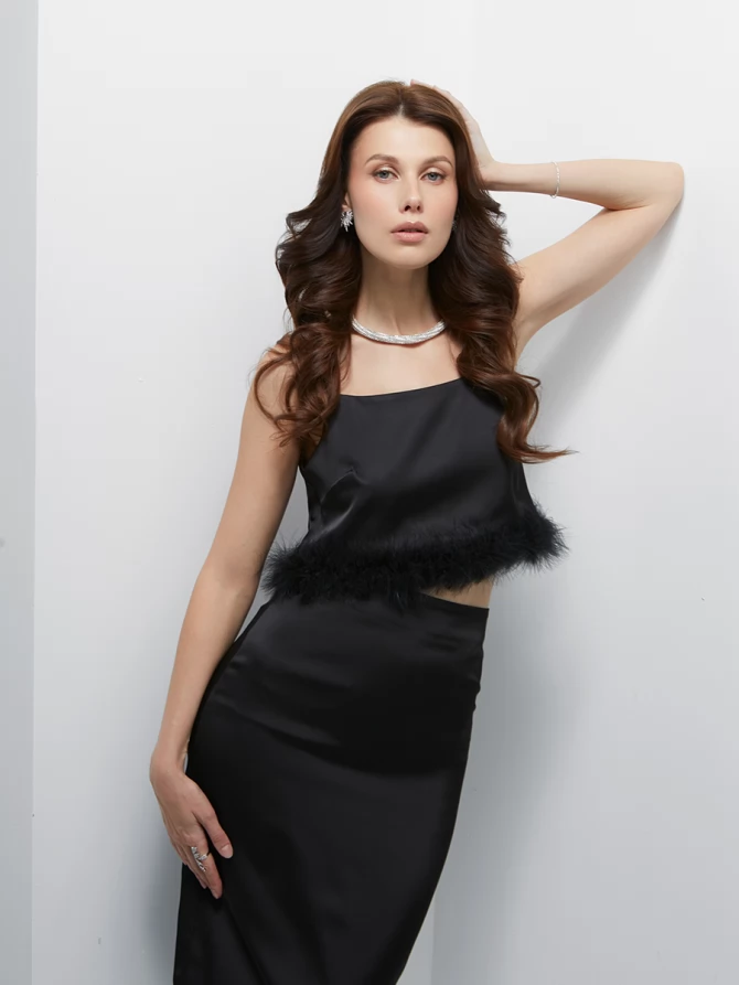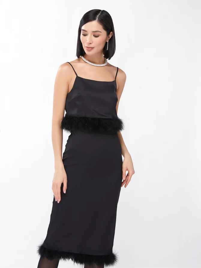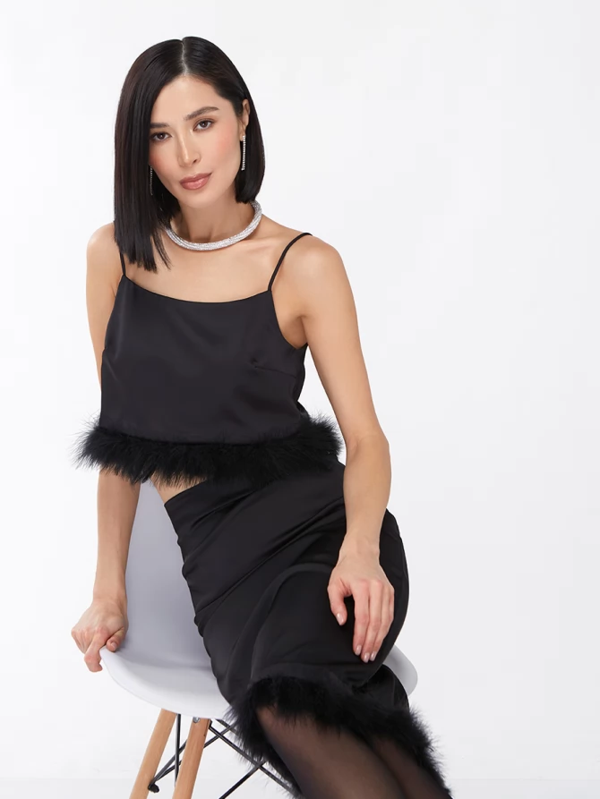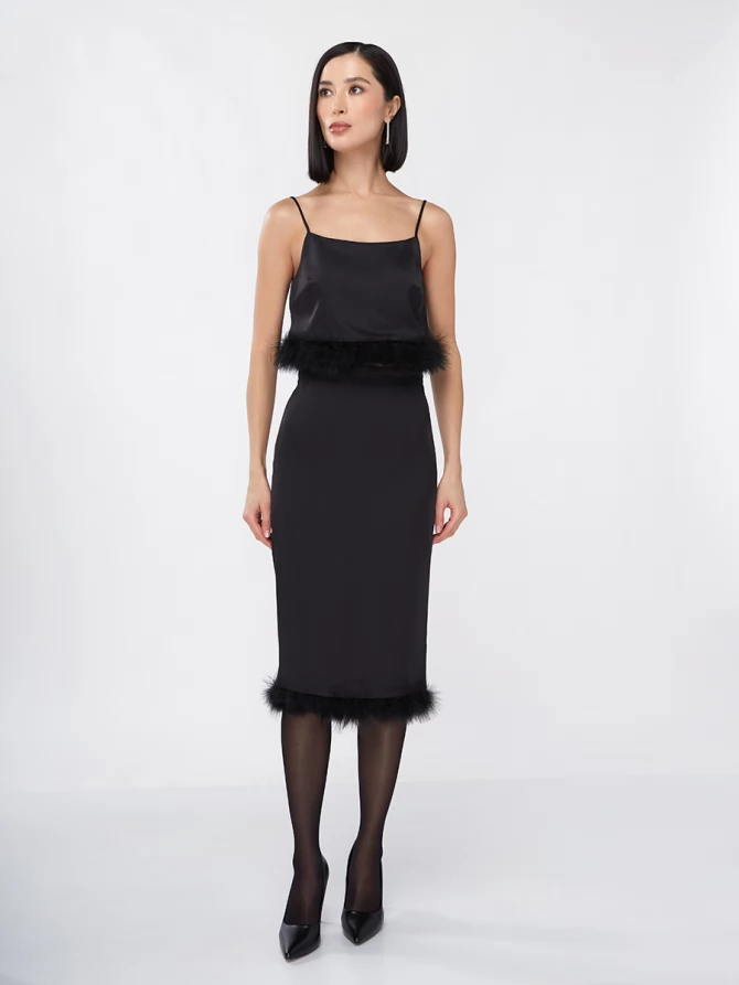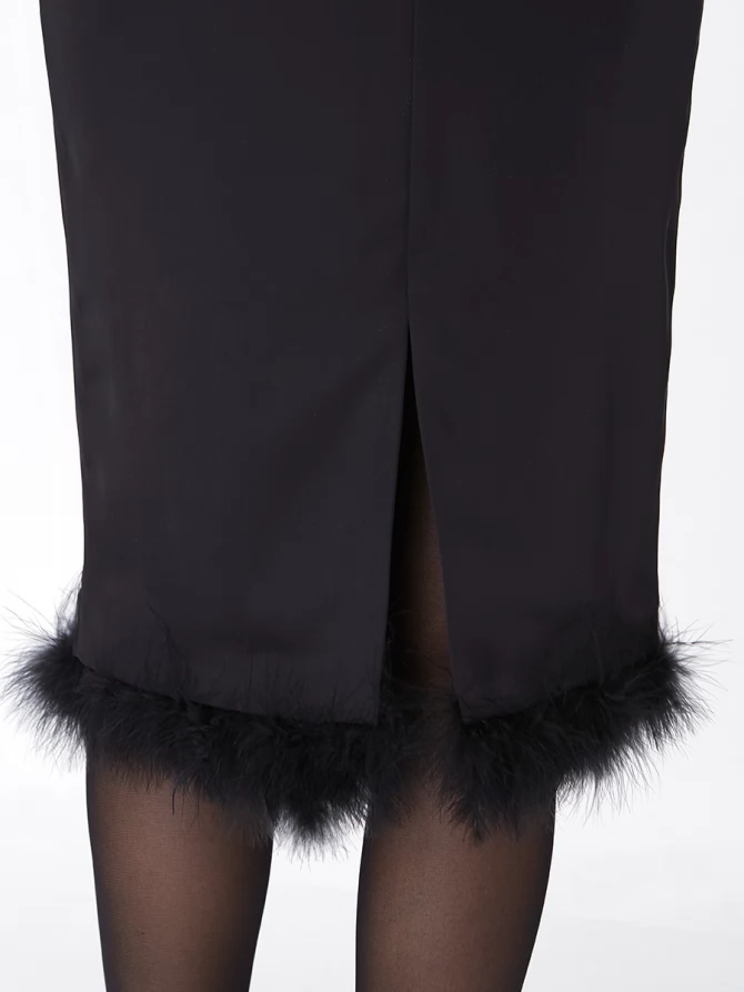 Эта модель — воплощение смелого fashion-заявления. Классический черный цвет в сочетании с ультрамодными декоративными перьями на подоле превращает юбку в звезду любого гардероба. Она создана для женщин, которые ценят эксклюзивность, высокое качество и хотят быть в центре внимания.